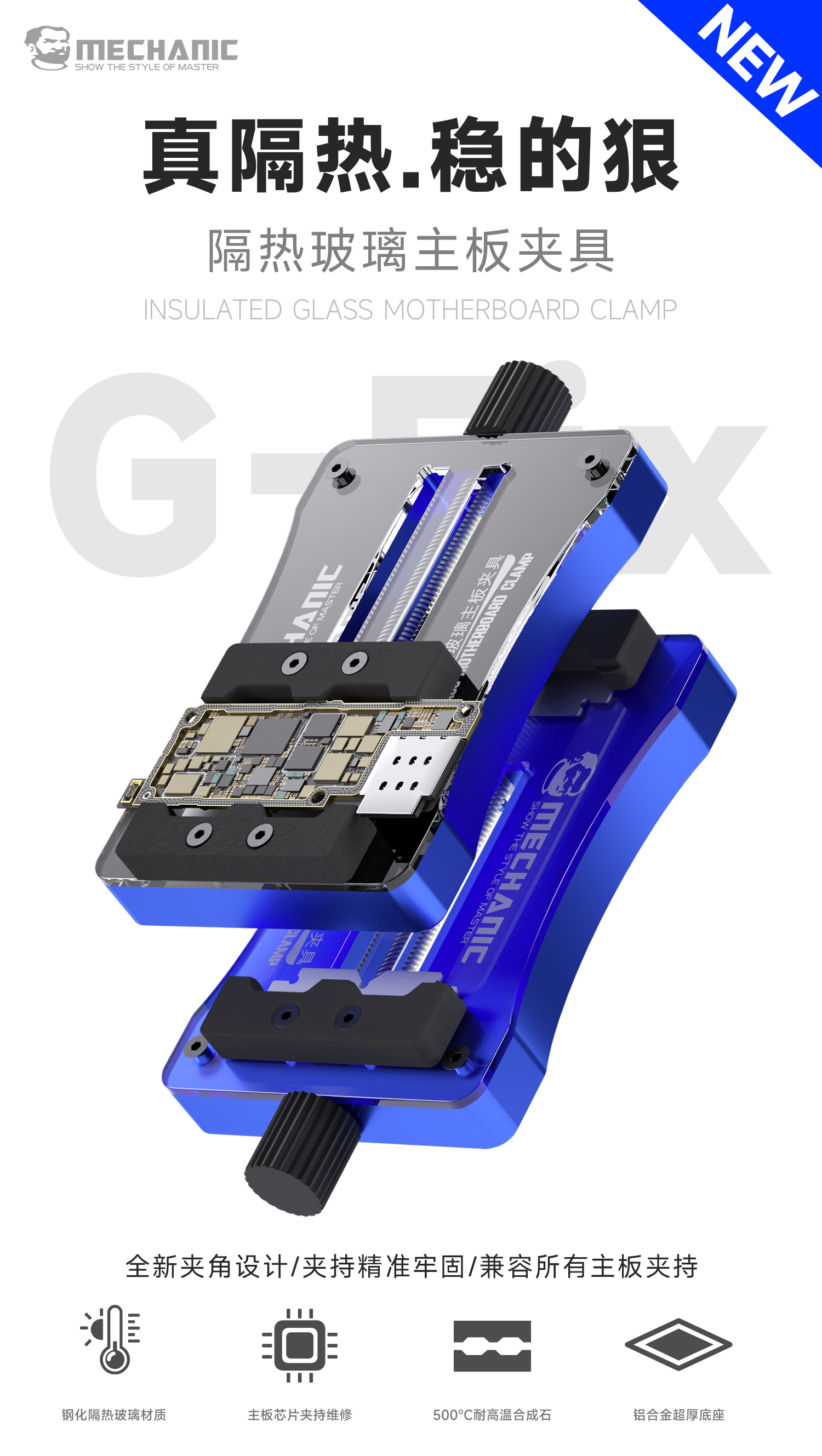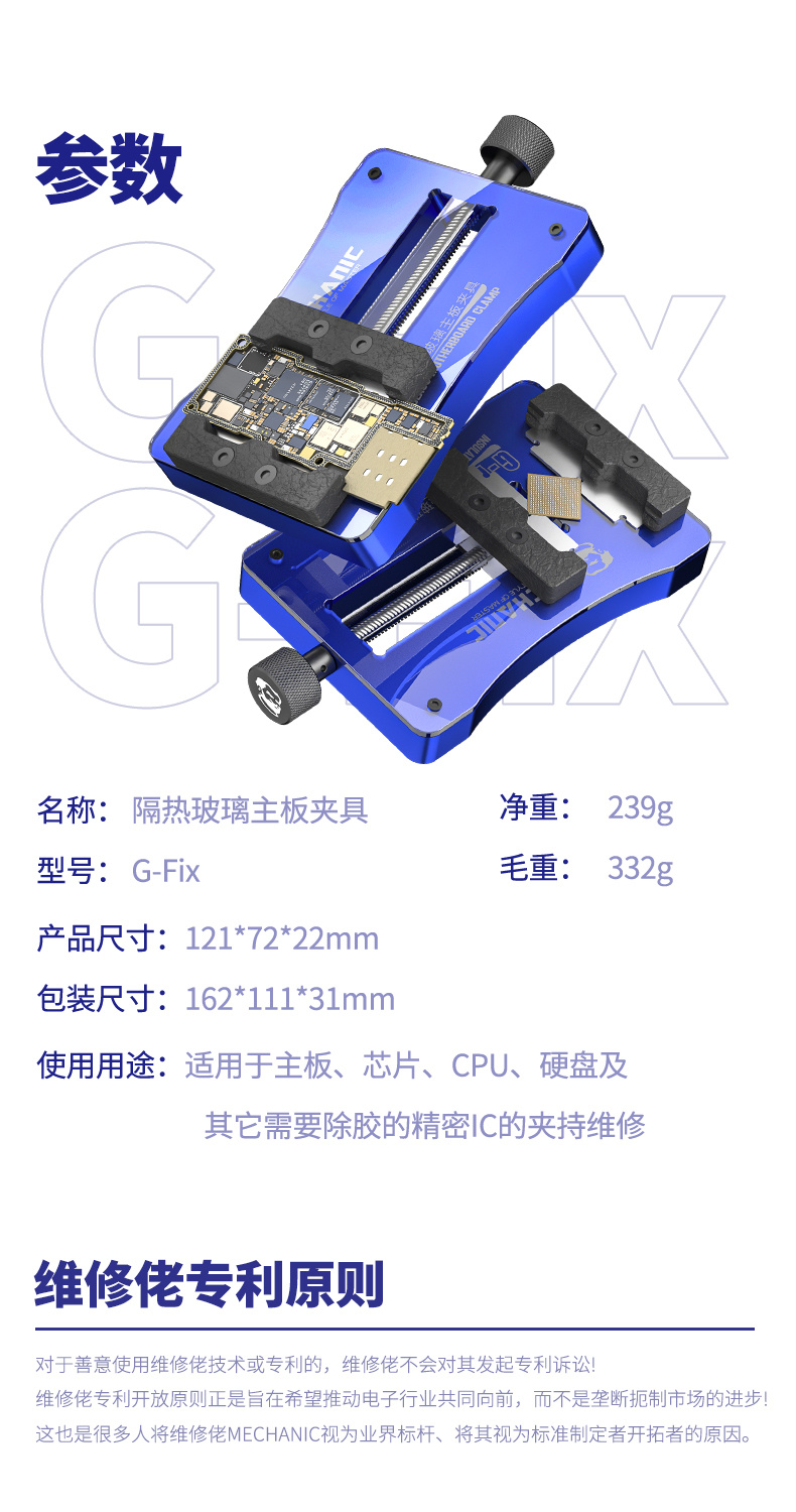 New angle design, extended wheelbase, high-temperature glass panel, compact and lightweight, suitable for holding and repairing motherboards, chips, CPUs, hard drives, and other precision ICs that require adhesive removal.