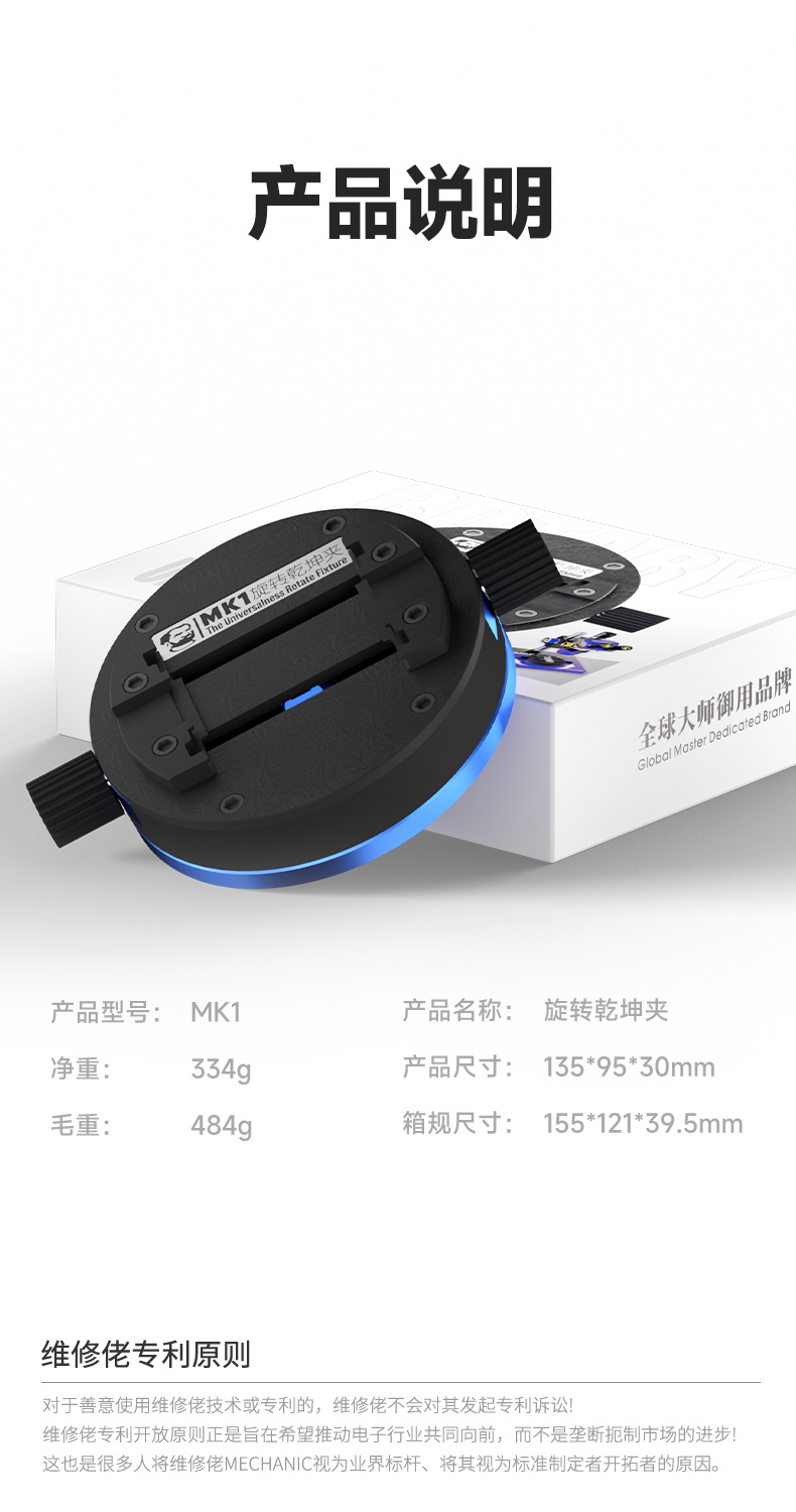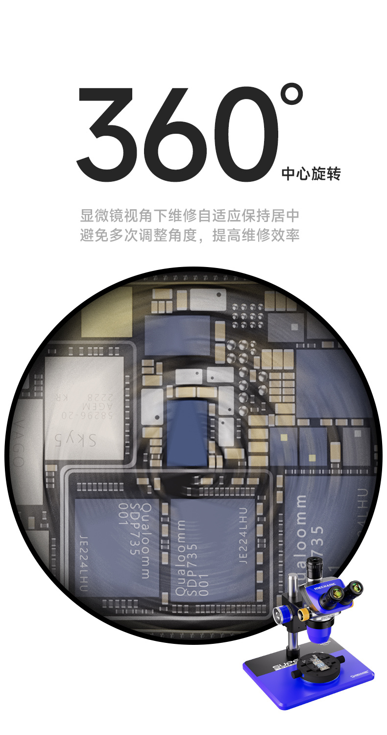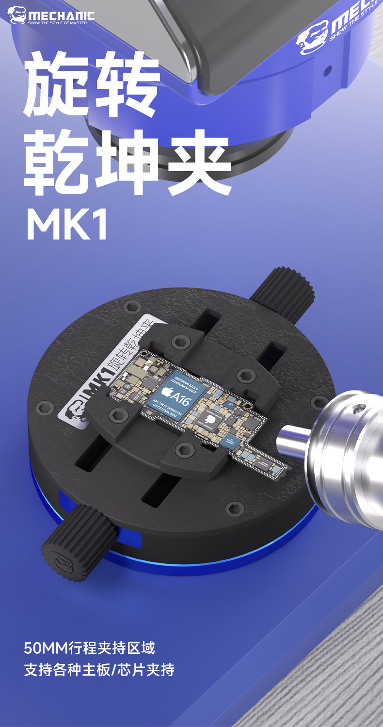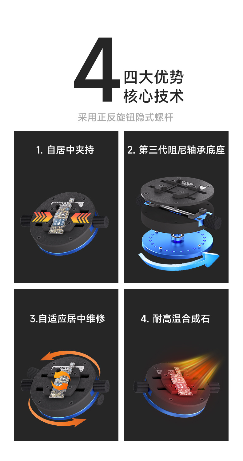 50mm stroke clamping area, clamps various motherboards/chips, self-centering clamping, 360° rotation, damping turntable, multi-scene operation